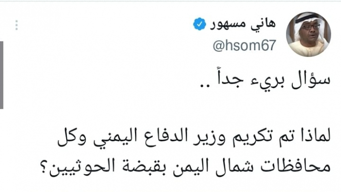 وتساءل في تغريدة على حسابه بموقع التدوين المصغر تويتر، اليوم، قائلا: "سؤال بريء جداً، لماذا تم تكريم وزير الدفاع اليمني وكل محافظات شمال اليمن بقبضة الحوثيين؟".