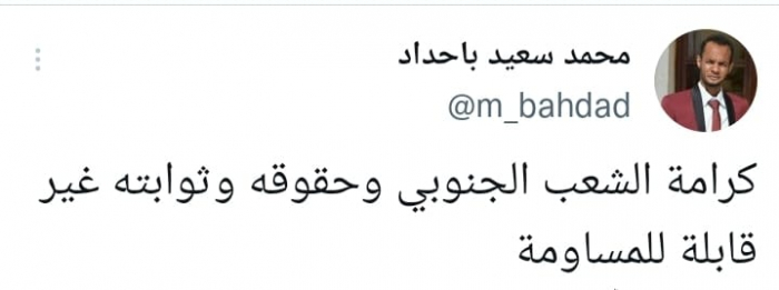 شدد الناشط السياسي محمد سعيد باحداد، على أن حقوق شعب الجنوب وكرامته خارج نطاق المساومة.
