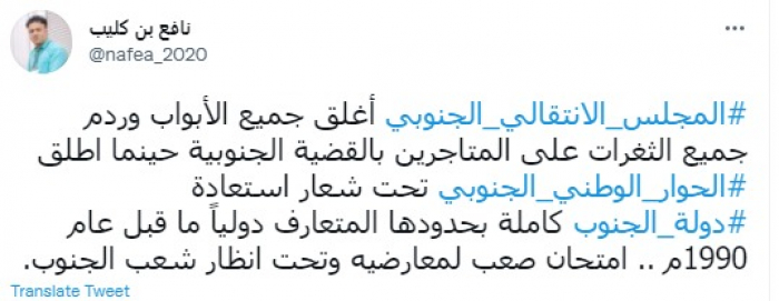 وقال في تغريدة عبر "تويتر" رصدها "المشهد العربي": "المجلس الانتقالي الجنوبي أغلق جميع الأبواب وردم جميع الثغرات على المتاجرين بالقضية الجنوبية".