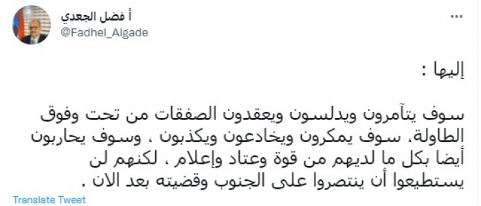 هاجم عضو هيئة رئاسة المجلس الانتقالي الجنوبي فضل الجعدي، اليوم الجمعة، قيادات الشرعية الإخوانية، مؤكدًا أن هؤلاء لن يستطيعوا الانتصار على الجنوب وقضيته.