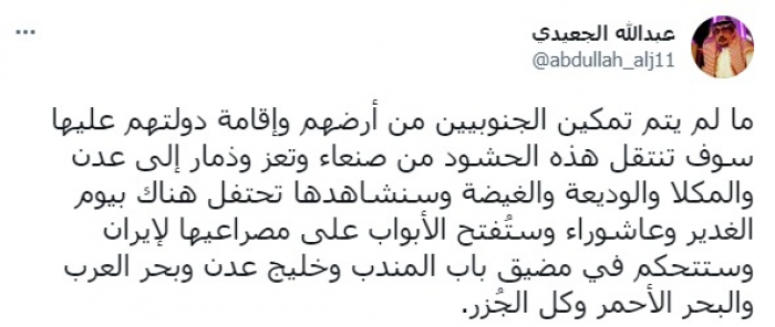 وأكد في تغريدة على حسابه بموقع التدوين المصغر تويتر، اليوم أنه: "ما لم يتم تمكين الجنوبيين من أرضهم وإقامة دولتهم عليها سوف تنتقل هذه الحشود من صنعاء وتعز وذمار إلى عدن والمكلا والوديعة والغيضة".