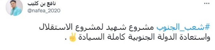 وقال في تغريدة عبر "تويتر" رصدها "المشهد العربي": "شعب الجنوب مشروع شهيد لمشروع الاستقلال واستعادة الدولة الجنوبية كاملة السيادة".