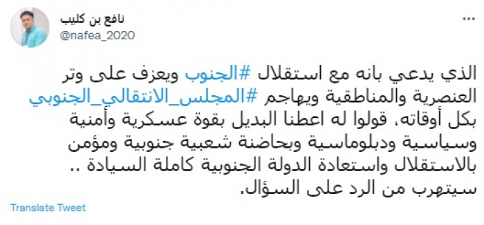 وقال في تغريدة عبر "تويتر" رصدها "المشهد العربي": "الذي يدعي بأنه مع استقلال الجنوب ويعزف على وتر العنصرية والمناطقية ويهاجم المجلس الانتقالي الجنوبي بكل أوقاته".