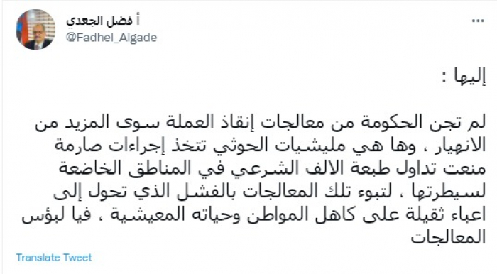 الجعدي: مُعالجات الشرعية بشأن العملة تحولت لأعباء بعد قرارات الحوثي