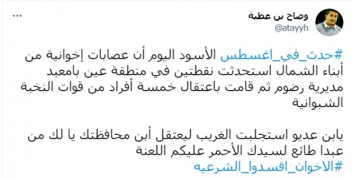 وأردف: "حدث في أغسطس الأسود اليوم أن عصابات إخوانية من أبناء الشمال استحدثت نقطتين في منطقة عين بامعبد مديرية رضوم ثم قامت باعتقال خمسة أفراد من قوات النخبة الشبوانية".