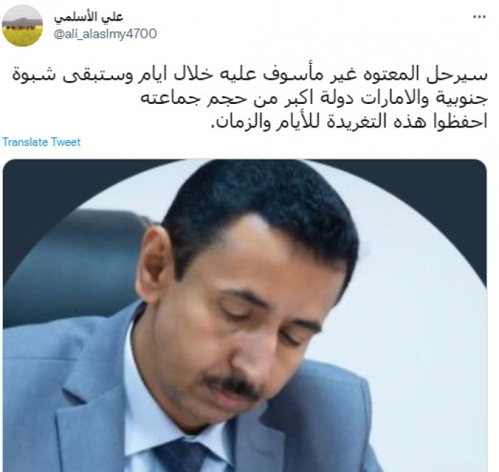 توقع الناشط السياسي علي الأسلمي، اليوم الأربعاء، رحيل محافظ شبوة الإخواني المدعو محمد بن عديو، من منصبه خلال أيام.