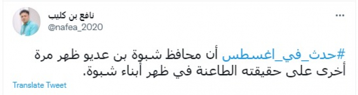 وقال في تغريدة عبر "تويتر" رصدها "المشهد العربي": "حدث في أغسطس أن محافظ شبوة بن عديو ظهر مرة أخرى على حقيقته الطاعنة في ظهر أبناء شبوة".