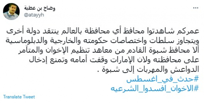 وقال في تغريدة عبر "تويتر" رصدها "المشهد العربي": "عمركم شاهدتوا محافظ أي محافظة بالعالم ينتقد دولة أخرى ويتجاوز سلطات واختصاصات حكومته الخارجية والدبلوماسية إلا محافظ شبوة".