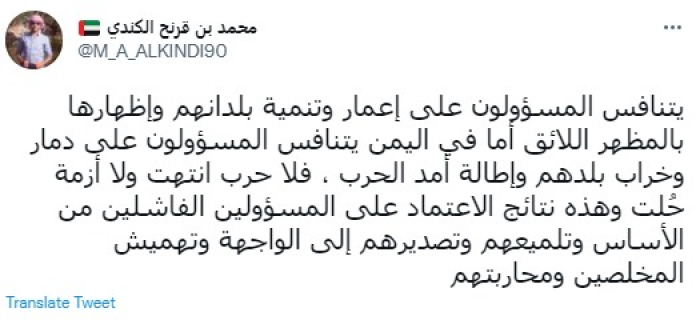 وقال في تغريدة عبر "تويتر" رصدها "المشهد العربي": "يتنافس المسؤولون على إعمار وتنمية بلدانهم وإظهارها بالمظهر اللائق أما في اليمن يتنافس المسؤولون على دمار وخراب بلدهم وإطالة أمد الحرب".
