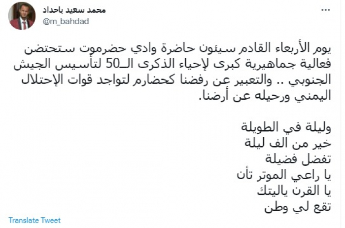 وقال في تغريدة عبر "تويتر" رصدها "المشهد العربي": "يوم الأربعاء القادم سيئون حاضرة وادي حضرموت ستحتضن فعالية جماهيرية كبرى لإحياء الذكرى الــ50 لتأسيس الجيش الجنوبي .. والتعبير عن رفضنا كحضارم لتواجد قوات الاحتلال اليمني ورحيله عن أرضنا".