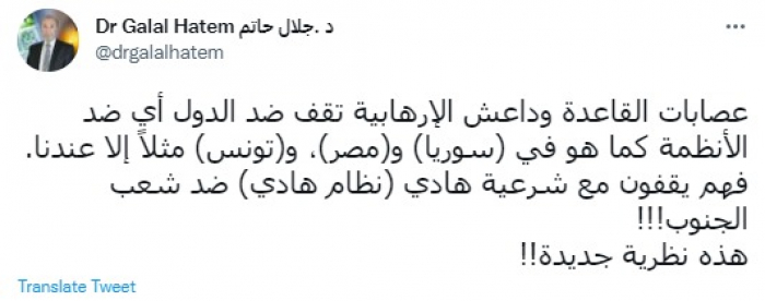 وقال في تغريدة عبر "تويتر" رصدها "المشهد العربي": "عصابات القاعدة وداعش الإرهابية تقف ضد الدول أي ضد الأنظمة كما هو في سوريا ومصر، وتونس مثلًا إلا عندنا. فهم يقفون مع شرعية هادي (نظام هادي) ضد شعب الجنوب".