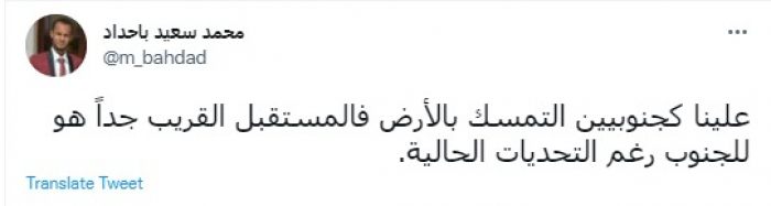 وقال في تغريدة عبر "تويتر" رصدها "المشهد العربي": "علينا كجنوبيين التمسك بالأرض فالمستقبل القريب جدا هو للجنوب رغم التحديات الحالية".