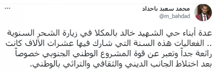 وقال في تغريدة على حسابه بموقع التدوين المصغر تويتر، اليوم إن: "عدة أبناء حي الشهيد خالد بالمكلا في زيارة الشحر السنوية".