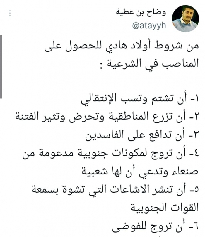 ورأى في تغريدة على حسابه بموقع التدوين المصغر تويتر اليوم أن: "من شروط أولاد هادي للحصول على المناصب في الشرعية أن تشتم وتسب الانتقالي وأن تزرع المناطقية وتحرض وتثير الفتنة".