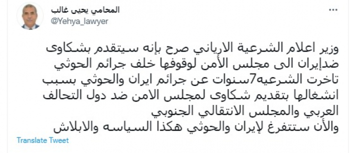 وقال في تغريدة عبر "تويتر" رصدها "المشهد العربي": "وزير إعلام الشرعية الإرياني صرح بأنه سيتقدم بشكاوى ضد إيران إلى مجلس الأمن لوقوفها خلف جرائم الحوثي".
