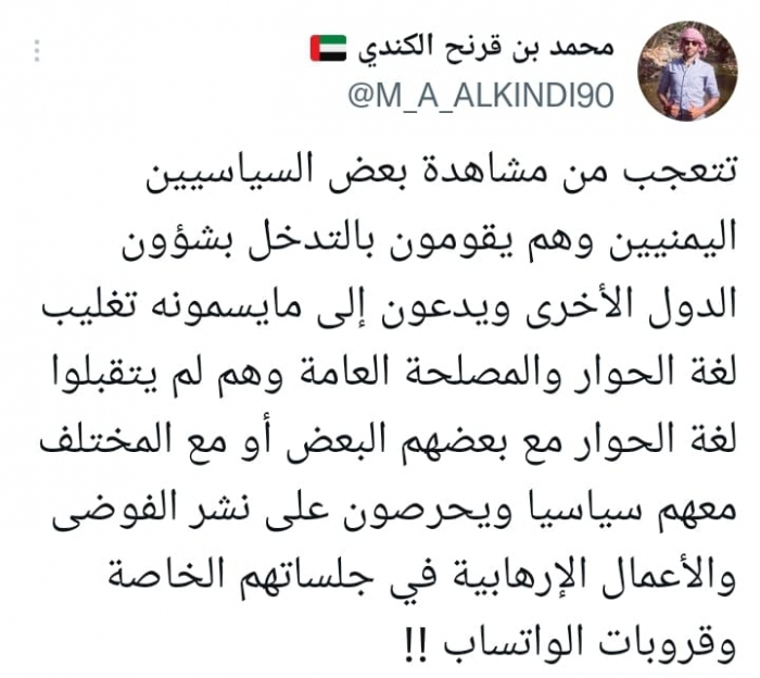 وقال في تغريدة على حسابه بموقع التدوين المصغر تويتر اليوم إنه: "تتعجب من مشاهدة بعض السياسيين اليمنيين وهم يقومون بالتدخل بشؤون الدول الأخرى ويدعون إلى مايسمونه تغليب لغة الحوار والمصلحة العامة".