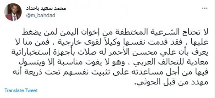 هاجم الناشط السياسي محمد سعيد باحداد، اليوم الأحد، الشرعية الإخوانية، مؤكدًا أنها قدمت نفسها كوكيل لقوى خارجية.