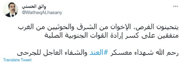 وقال في تغريدة عبر "تويتر" رصدها "المشهد العربي": "يتحينون الفرص، الإخوان من الشرق والحوثيين من الغرب متفقين على كسر إرادة القوات الجنوبية الصلبة، رحم الله شهداء معسكر العند والشفاء العاجل للجرحى".