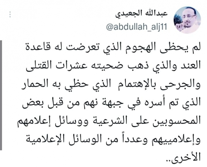 وكشف في تغريدة على حسابه بموقع التدوين المصغر تويتر، اليوم أنه: "لم يحظ الهجوم الذي تعرضت له قاعدة العند والذي ذهب ضحيته عشرات القتلى والجرحى بالاهتمام الذي حظي به الحمار الذي تم أسره في جبهة نهم من قبل بعض المحسوبين على الشرعية ووسائل إعلامهم وإعلامييهم وعدد من الوسائل الإعلامية الأخرى"