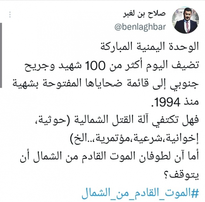 وقال في تغريدة على حسابه بموقع التدوين المصغر تويتر، اليوم إن: "الوحدة اليمنية المباركة تضيف اليوم أكثر من 100 شهيد وجريح جنوبي إلى قائمة ضحاياها المفتوحة بشهية منذ 1994".
