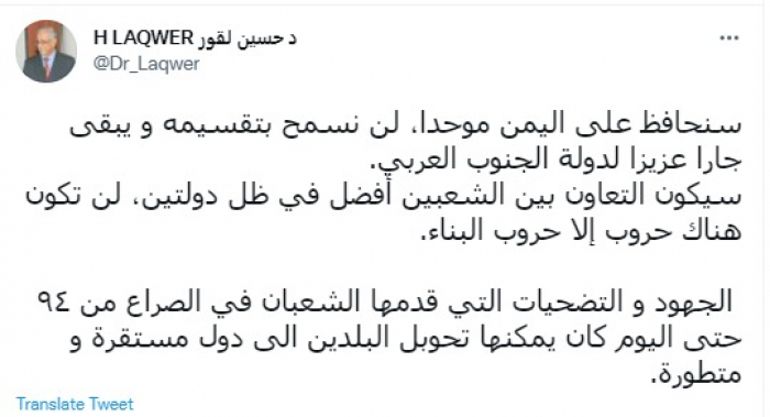 وكتب في تغريدة عبر "تويتر" رصدها "المشهد العربي": "سنحافظ على اليمن موحدًا، لن نسمح بتقسيمه ويبقى جارًا عزيزًا لدولة الجنوب العربي".