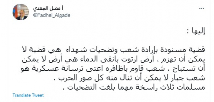 وكتب في تغريدة عبر "تويتر" رصدها "المشهد العربي": "قضية مسنودة بإرادة شعب وتضحيات شهداء هي قضية لا يمكن أن تُهزم ".