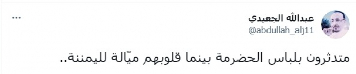 ورأى في تغريدة على حسابه بموقع التدوين المصغر تويتر، اليوم أن هناك: "متدثرون بلباس الحضرمة بينما قلوبهم ميّالة لليمننة".