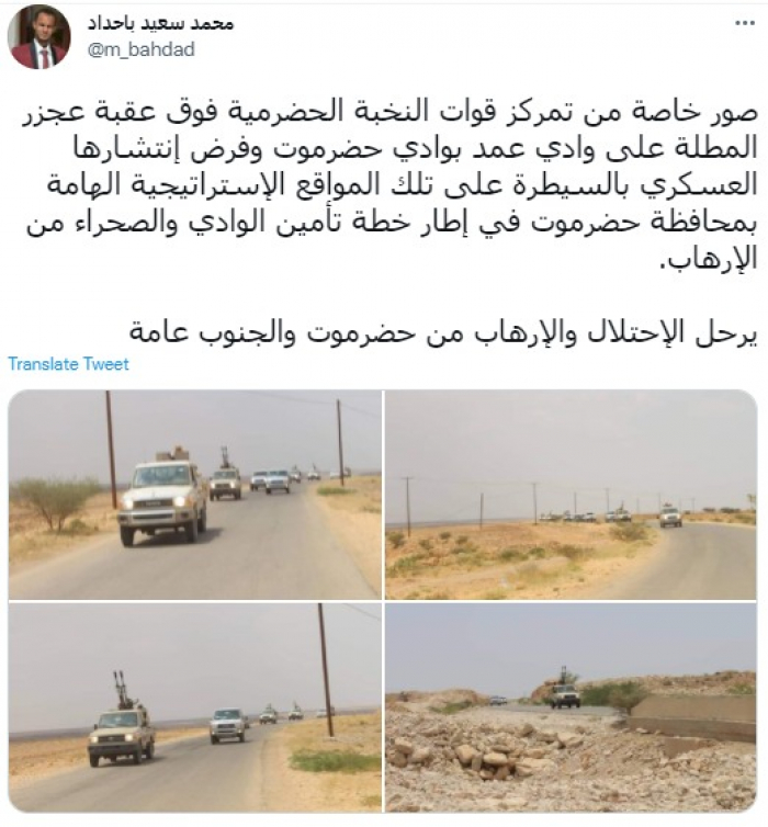 وقال في تغريدة عبر "تويتر" رصدها "المشهد العربي": "صور خاصة من تمركز قوات النخبة الحضرمية فوق عقبة عجزر المطلة على وادي عمد بوادي حضرموت وفرض انتشارها العسكري بالسيطرة على تلك المواقع الإستراتيجية الهامة بمحافظة حضرموت في إطار خطة تأمين الوادي والصحراء من الإرهاب".