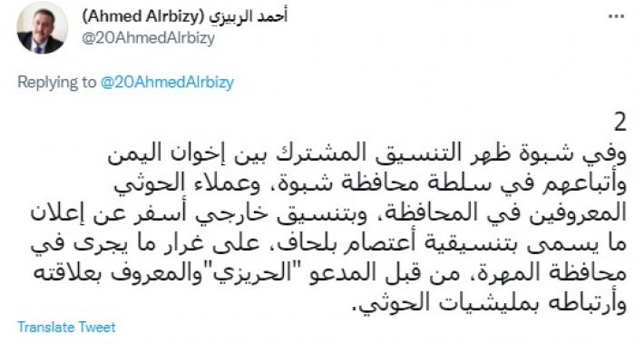 الربيزي يكشف عن أسرار التنسيق بين الحوثي والإخوان بشأن شبوة