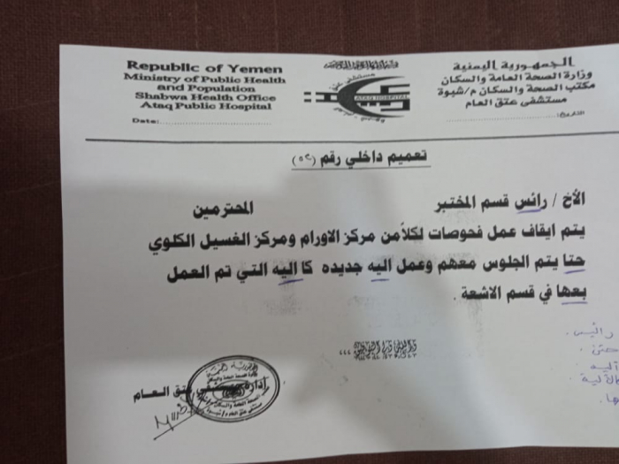 أوقفت إدارة مستشفى عتق العام بمحافظة شبوة الخاصعة لمليشيات الشرعية الإخوانية، أعمال فحصاد لمرضى مركزي الأورام ومركز غسيل الكلى.