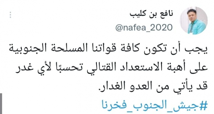 طالب الناشط السياسي نافع بن كليب القوات المسلحة الجنوبية بالحفاظ على أقصى درجات اليقظة القتالية.