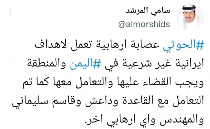 وأكد في تغريدة على حسابه بموقع التدوين المصغر تويتر، اليوم أن: "الحوثي عصابة إرهابية تعمل لأهداف إيرانية غير شرعية في اليمن والمنطقة".