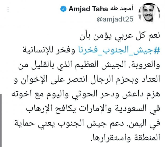 وقال في تغريدة على حسابه بموقع التدوين المصغر تويتر، اليوم: "نعم كل عربي يؤمن بأن جيش الجنوب فخرنا وفخر للإنسانية والعروبة".