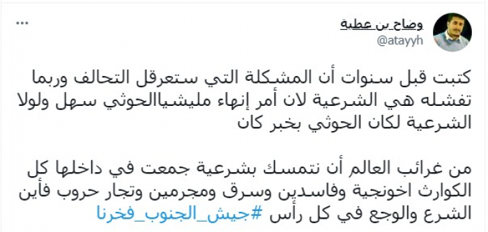 ووصف التمسك بالشرعية بـ"غرائب العالم"، مضيفا أنها "جمعت في داخلها كل الكوارث إخونجية وفاسدين وسرق ومجرمين وتجار حروب فأين الشرع والوجع في كل رأس".