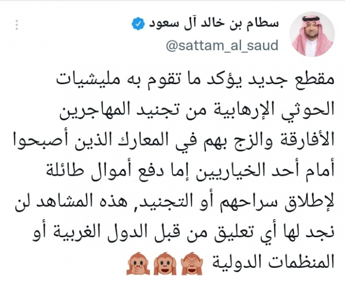 تعجب الأمير السعودي سطام بن خالد آل سعود من التغاضي الدولي عن تجنيد مليشيا الحوثي الإرهابية للاجئين الأفارقة واستغلالهم في صراعها.