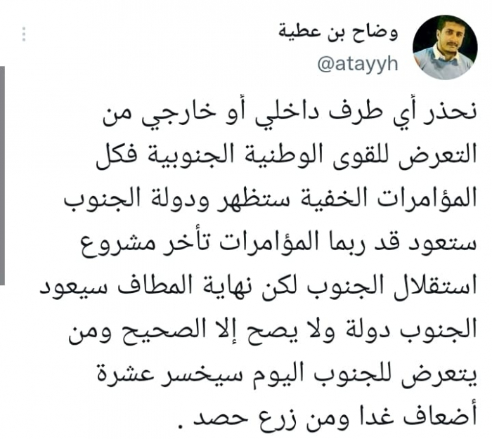 وقال في تغريدة على حسابه بموقع التدوين المصغر تويتر، اليوم إننا: "نحذر أي طرف داخلي أو خارجي من التعرض للقوى الوطنية الجنوبية فكل المؤامرات الخفية ستظهر ودولة الجنوب ستعود".