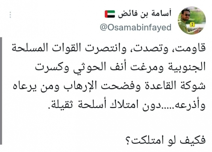 شدد الكاتب الصحفي أسامة بن فائض على انتصار القوات المسلحة الجنوبية على التنظيمات الإرهابية ومليشيات الحوثي الإرهابية بتسليح خفيف.