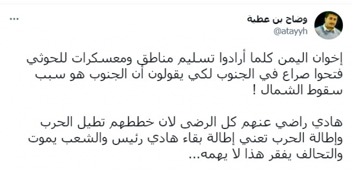 وأشار في تغريدة على حسابه بتويتر، اليوم الخميس إلى أن: "إخوان اليمن كلما أرادوا تسليم مناطق ومعسكرات للحوثي فتحوا صراع في الجنوب لكي يقولون أن الجنوب هو سبب سقوط الشمال".