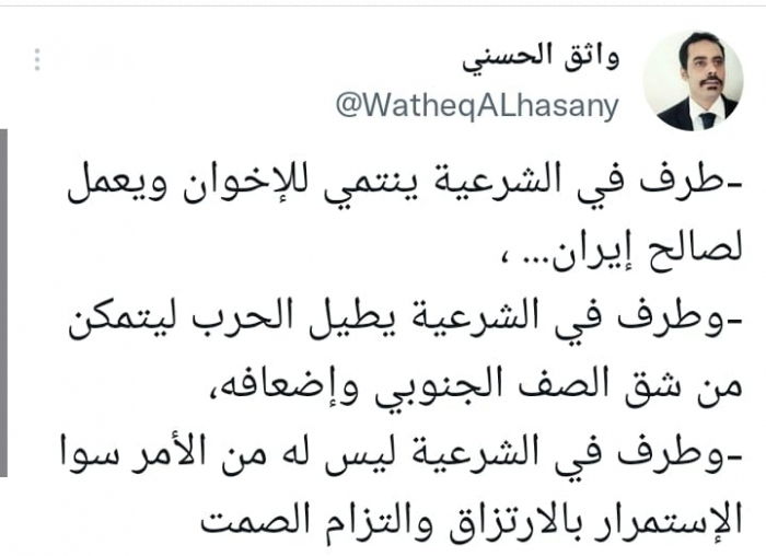 وقال في تغريدة على حسابه بموقع التدوين المصغر تويتر، اليوم إنه: "طرف في الشرعية ينتمي للإخوان ويعمل لصالح إيران، وطرف في الشرعية يطيل الحرب ليتمكن من شق الصف الجنوبي وإضعافه".