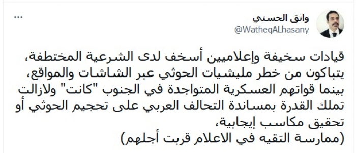 وقال في تغريدة عبر "تويتر"، اليوم الجمعة: "قيادات سخيفة وإعلاميين أسخف لدى الشرعية المختطفة، يتباكون من خطر مليشيات الحوثي عبر الشاشات والمواقع".