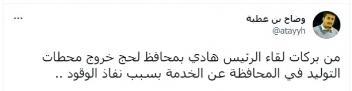 وكتب في تغريدة عبر "تويتر" اليوم الجمعة: "من بركات لقاء الرئيس هادي بمحافظ لحج خروج محطات التوليد في المحافظة عن الخدمة بسبب نفاد الوقود".