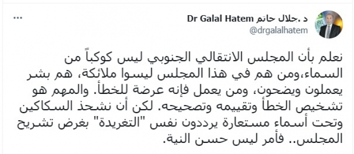 وأوضح في تغريدة عبر "تويتر"، اليوم الجمعة: "نعلم بأن المجلس الانتقالي الجنوبي ليس كوكبا من السماء، ومن هم في هذا المجلس ليسوا ملائكة، هم بشر يعملون ويضحون، ومن يعمل فإنه عرضة للخطأ".