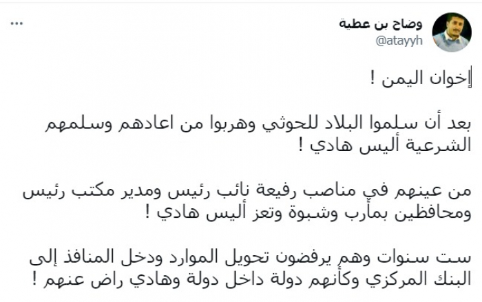وتساءل في تغريدة على حسابه بموقع التدوين المصغر تويتر، اليوم أن: "إخوان اليمن، بعد أن سلموا البلاد للحوثي وهربوا، من أعادهم وسلمهم الشرعية؟ أليس هادي؟".