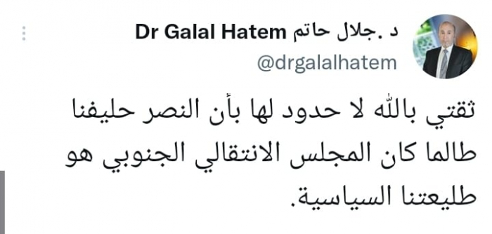عبر الأكاديمي الجنوبي الدكتور جلال حاتم، رئيس جامعة أم القيوين الإماراتية، عن ثقته في انتصار الجنوب بقيادة المجلس الانتقالي الجنوبي.