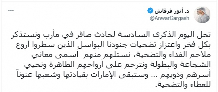 أشاد المستشار الدبلوماسي لرئيس الإمارات الدكتور أنور قرقاش، بتضحيات أبطال القوات المسلحة الإماراتية، وذلك بالتزامن مع الذكرى السادسة لحادث صافر الإرهابي في مأرب.