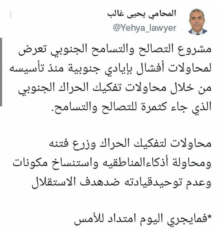 وأوضح في تغريدة على حسابه بموقع التدوين المصغر تويتر، اليوم أن: "مشروع التصالح والتسامح الجنوبي تعرض لمحاولات إفشال بأيادي جنوبية منذ تأسيسه من خلال محاولات تفكيك الحراك الجنوبي الذي جاء كثمرة للتصالح والتسامح".