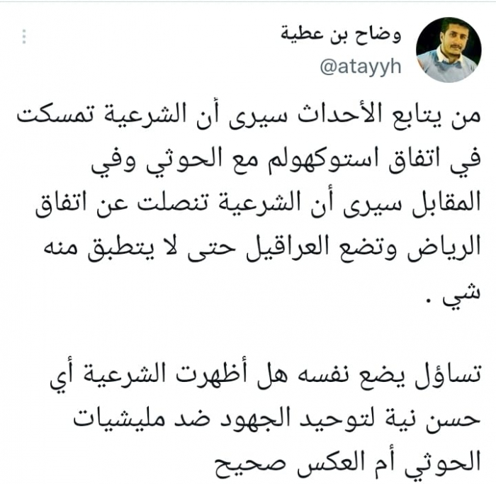 وأكد في تغريدة على حسابه بموقع التدوين المصغر تويتر، اليوم أن: "من يتابع الأحداث سيرى أن الشرعية تمسكت في اتفاق استوكهولم مع الحوثي".