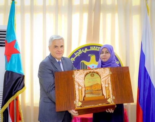 وفي نهاية اللقاء سلمت الدكتورة منى باشراحيل هدية تذكارية للسفير الروسي، بهذه بمناسبة زيارته للعاصمة الجنوبية عدن.